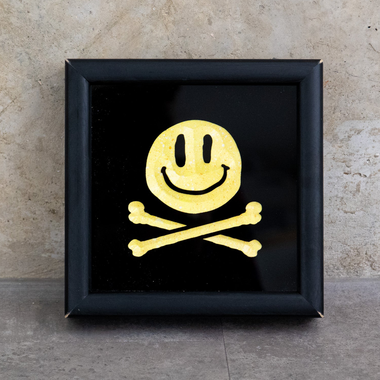 - Silkscreen, glass and Resin in distressed black wooden frame