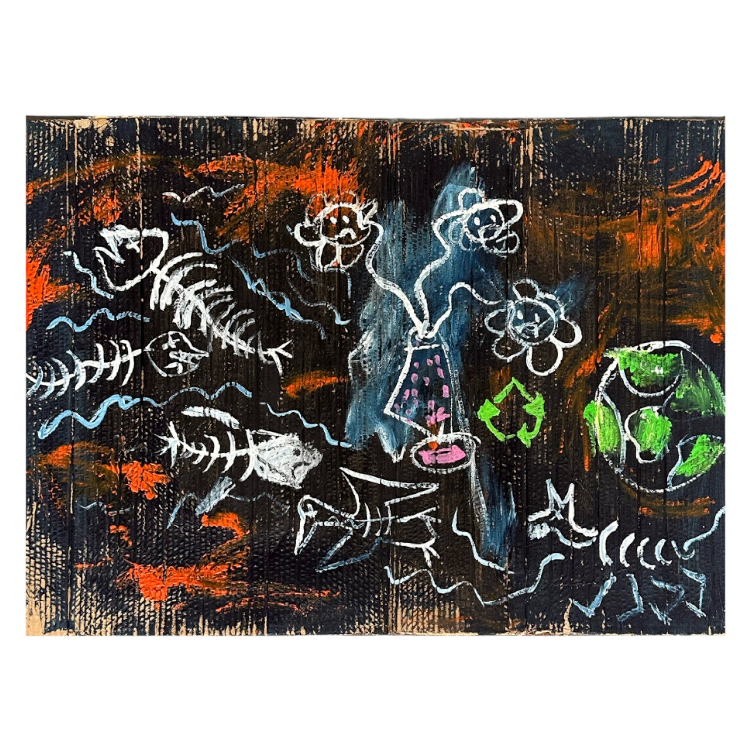THE RE-PYSCHLED DREAMS COLLECTION: A CHALLENGING PERIOD DURING LOCKDOWN, SAW BUDGET & RESOURCE CONSTRAINTS, HOWEVER NAVINDER INGENIOUSLY REPURPOSED DISCARDED CARDBOARD BOXES FROM SUPERMARKETS. HE TRANSFORMED THESE BOXES INTO THE RE-PYSYCHLED COLLECTION, USING THEM AS SUSTAINABLE CANVASES TO DEPICT A SERIES INSPIRED BY SLEEPLESS NIGHTS AND STRUGGLES WITH SLEEP PARALYSIS.