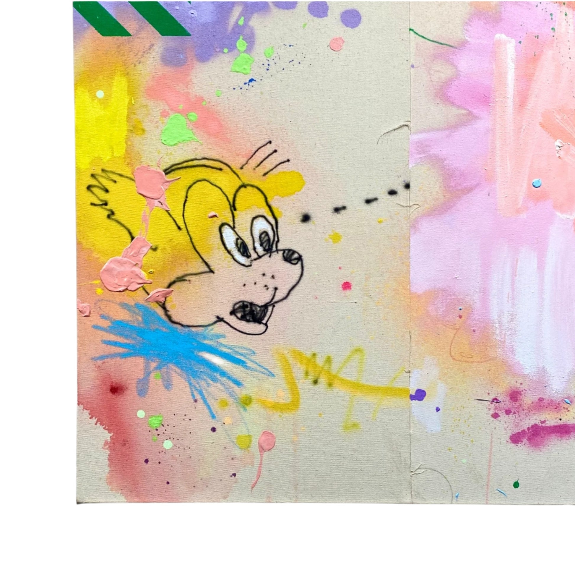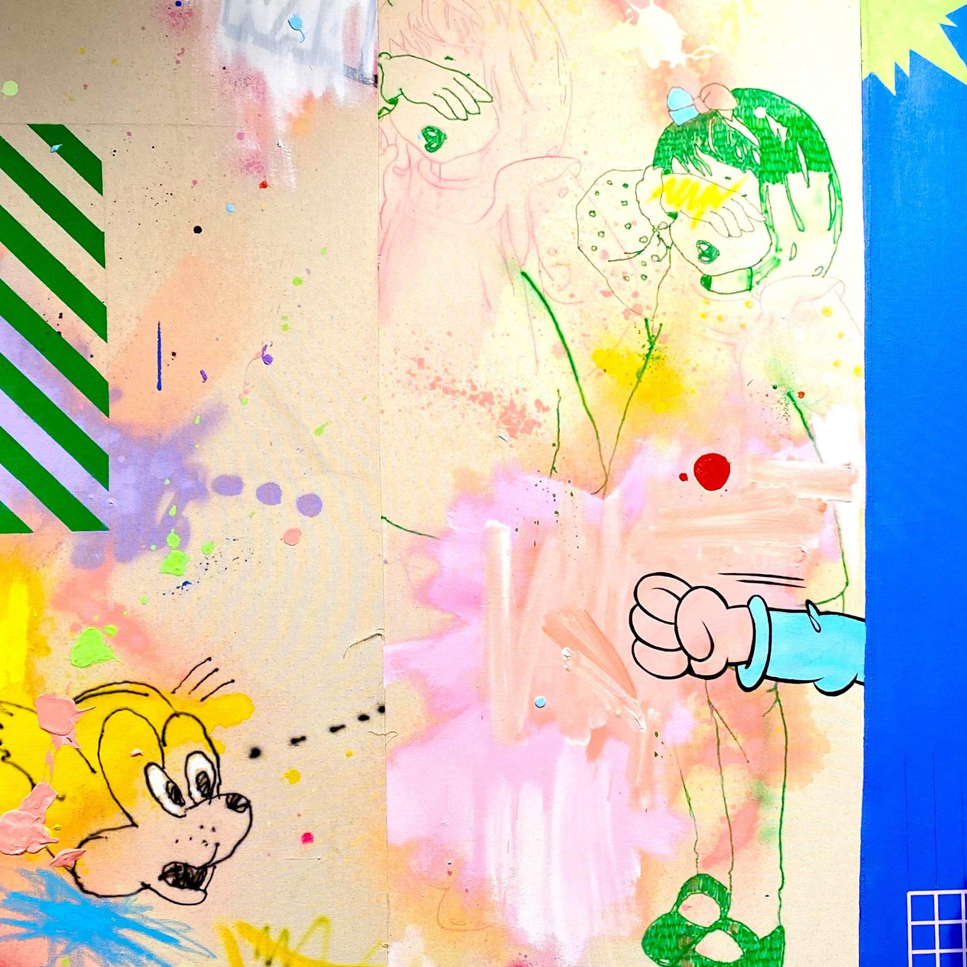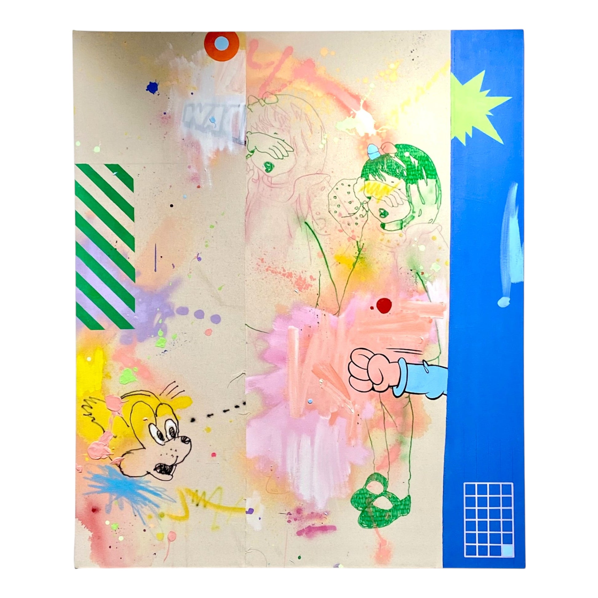 The paintings are not planned through to completion before they are started and instead evolve organically, what others might perceive as ‘mistakes’ are left on the raw canvas, becoming part of the finished work and conversing with the more fine-tuned areas of detail. His works subsequently have no specific narrative and can be interpreted in countless ways, each element jostling for position and steering the viewer to a different conclusion.
