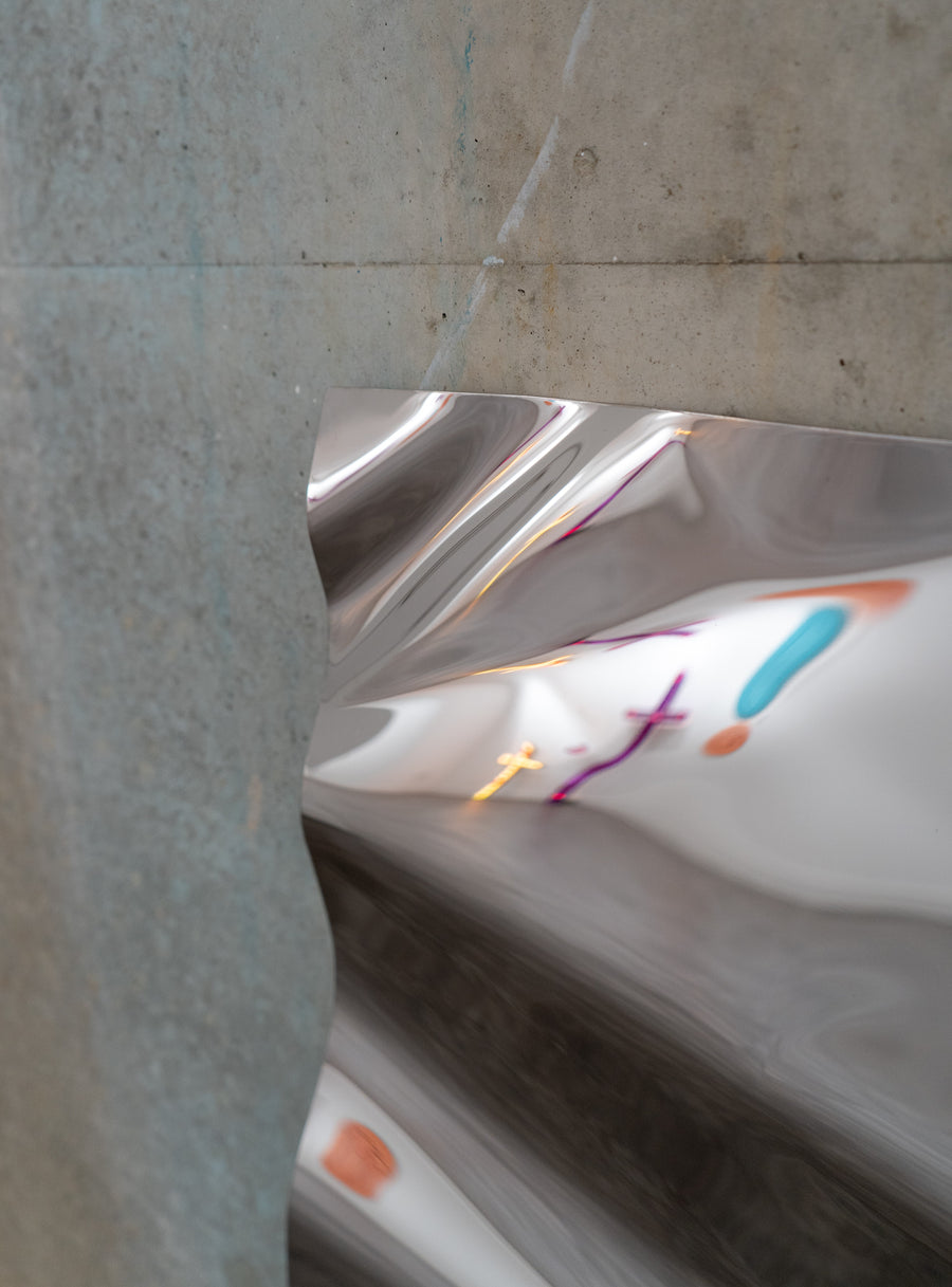 Hand crafted from a single sheet of stainless steel, each piece in Piers Henry's Lucid Mirror series is unique.