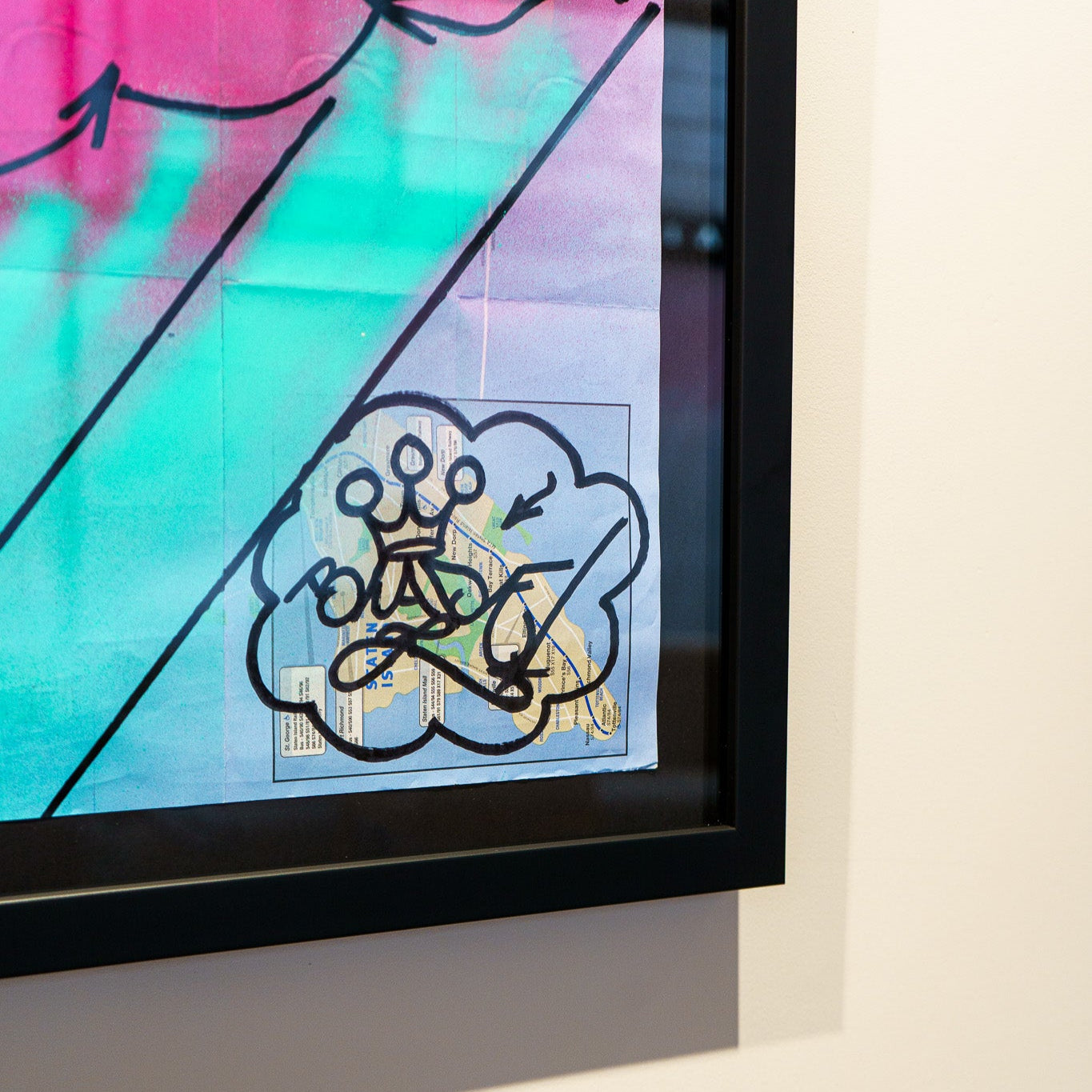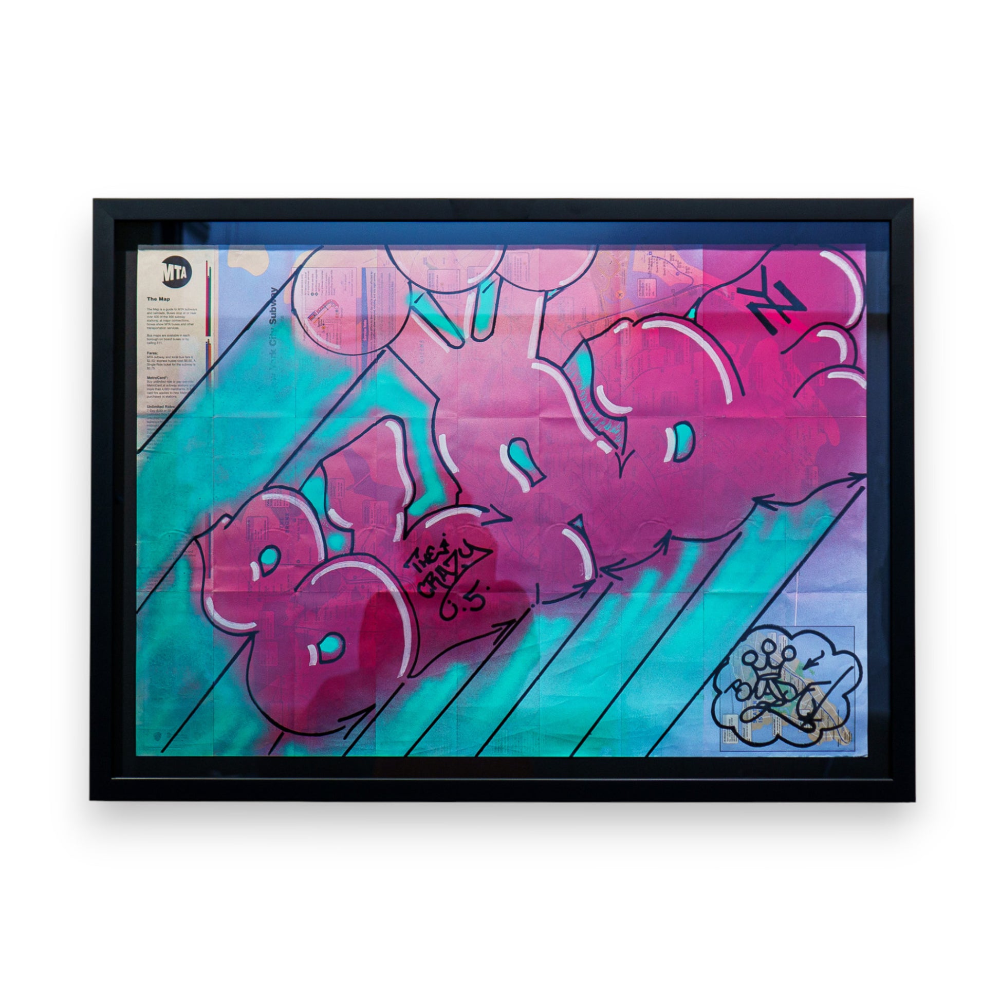 BLADE, born in the Bronx as Steven Ogburn, began painting graffiti in 1972. He was known for his whole-cars and has painted more than 5,000 trains in his career. His “Mainstreams” painting was done in spray paint and marker on canvas in 1990 as a response to other artists moving away from traditional graffiti lettering.