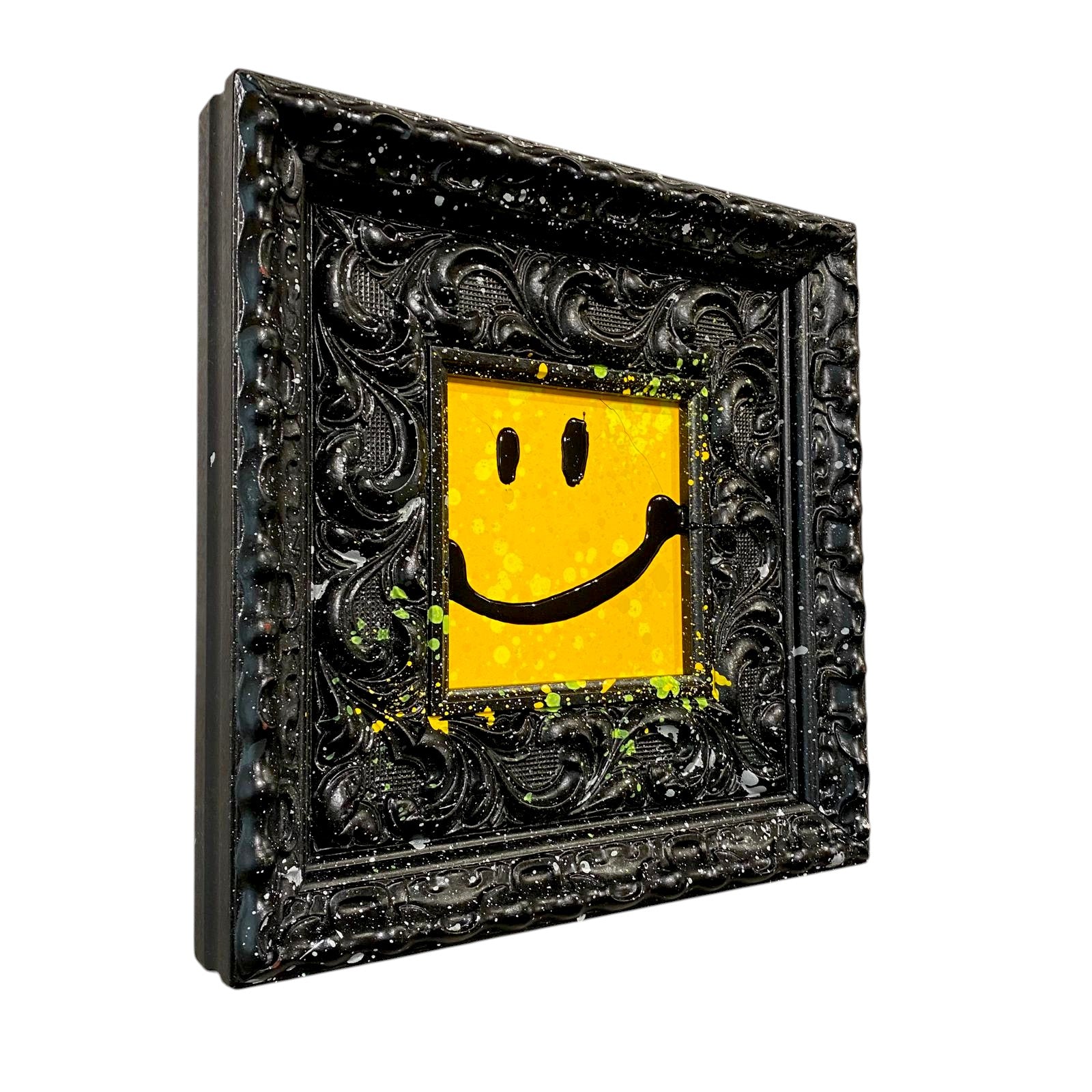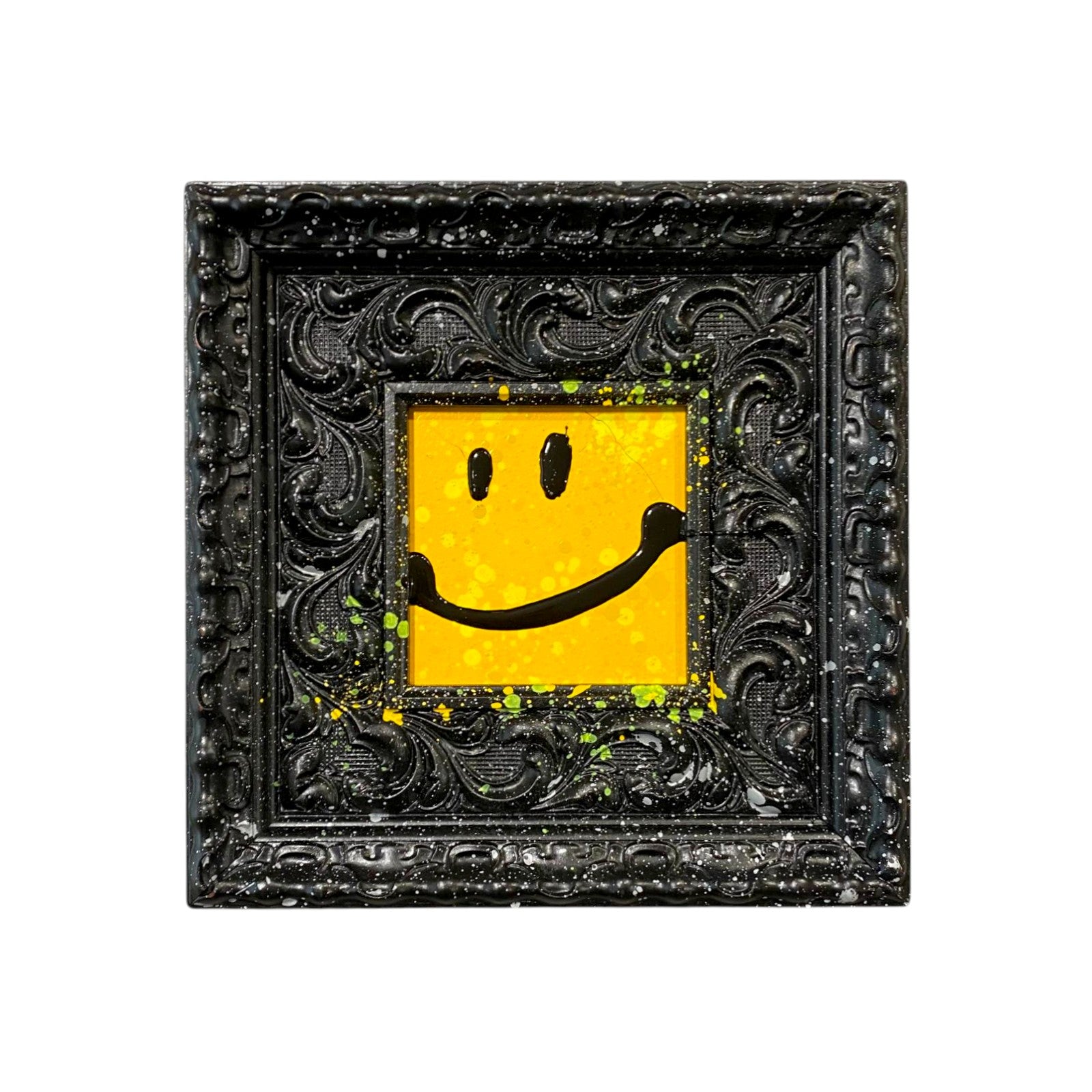 - Acrylic, spray paint and resin on wood in vintage frame