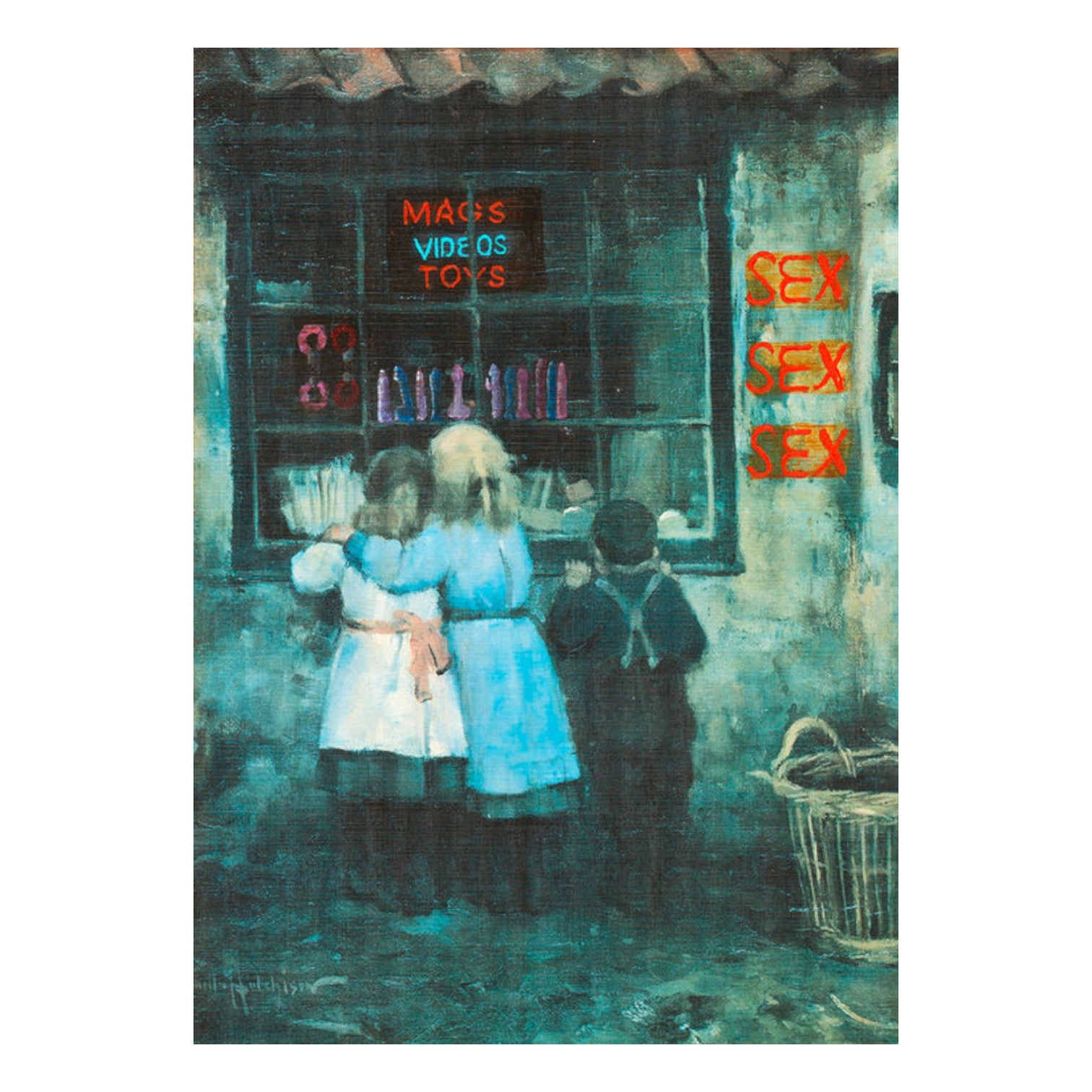 Specialising in the re-appropriation of classic British ephemera, her work juxtaposes traditional imagery with humorous motifs and branding often seeking to create a playful yet impactful dialogue on consumerism, masculinity and the banality of modern life.