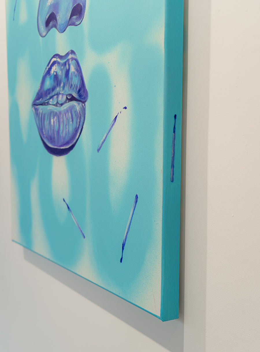 Her work is instantly recognisable, her signature use of bright colours and uncanny humour gives her pieces a surreal and vibrant edge that feels relentlessly modern and effortlessly unique. She works quickly, never starting with a clear plan, she works on the face element first before taping up and spray painting afterwards.